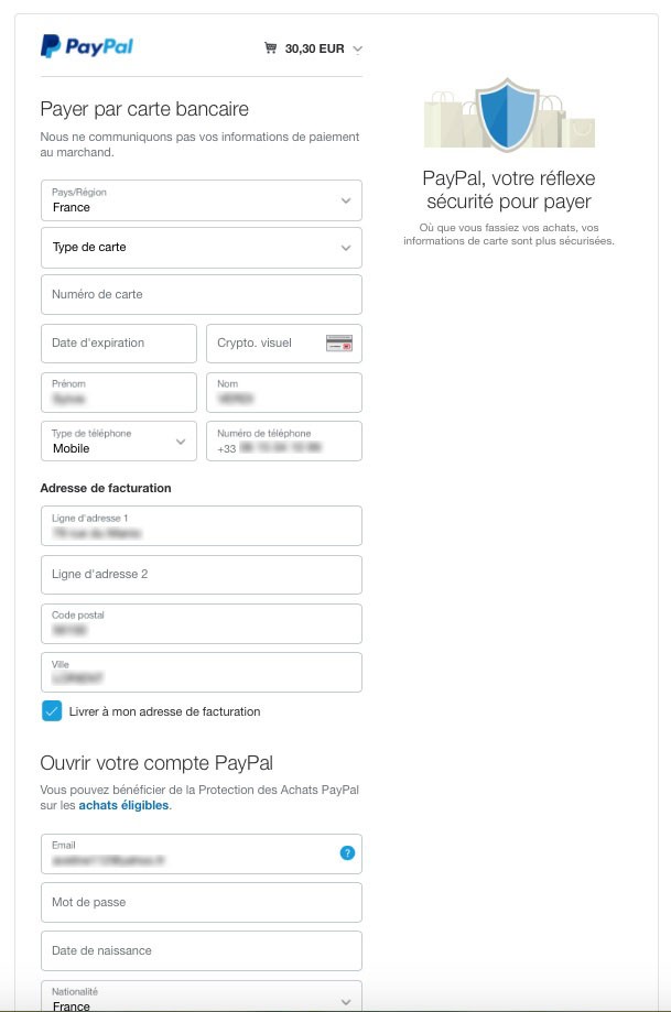 PayPal vous propose alors de choisir votre type de carte bancaire et de renseigner vos coordonnées. Vous devez remplir intégralement le formulaire proposé ci-contre, y compris le numéro de téléphone. Veillez à bien vérifier que votre adresse email est correctement écrite :