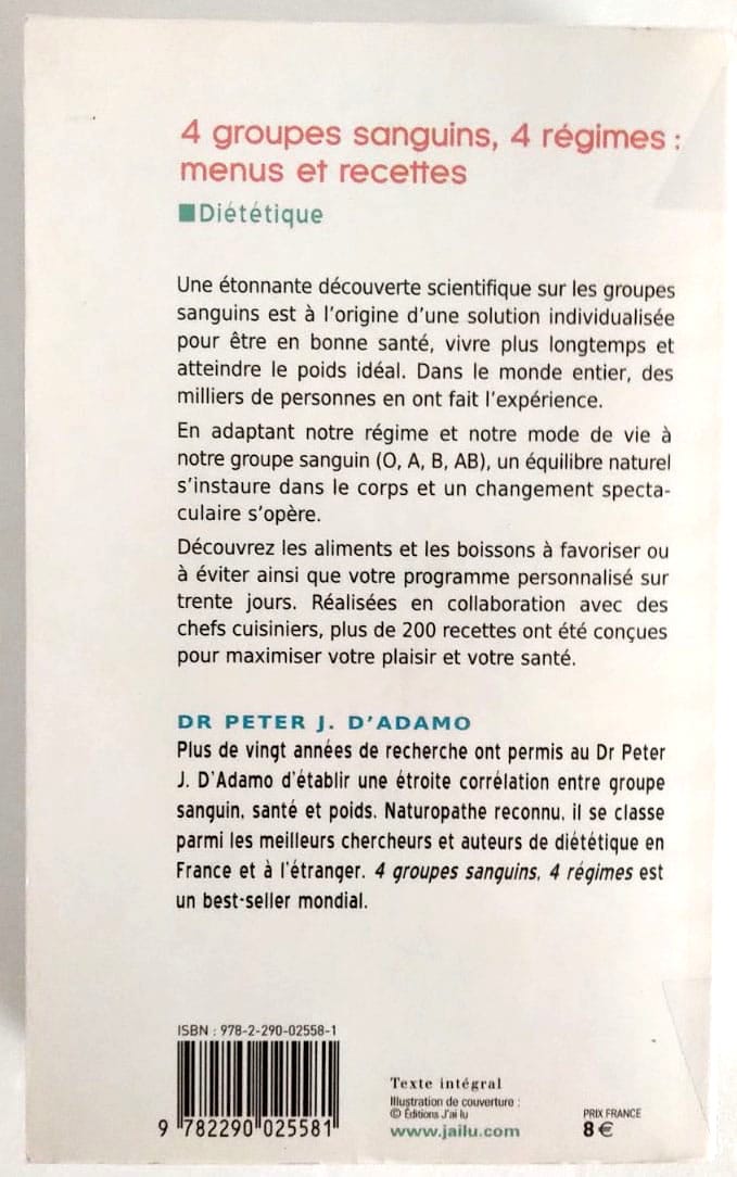 Titre : 4 groupes sanguins, 4 régimes : menus et recettes