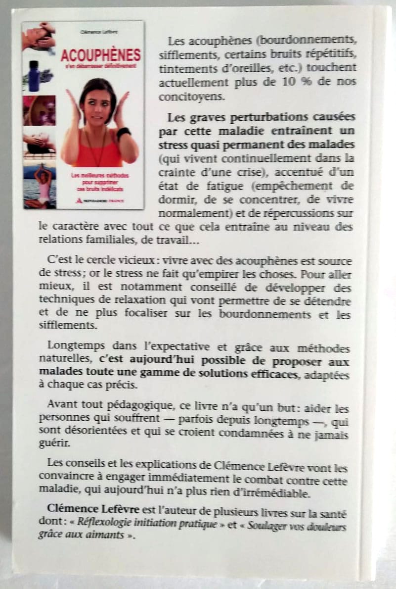 Les acouphènes (bourdonnements, sifflements, bruits répétitifs, tintements d’oreilles, etc.) touchent actuellement plus de 10 % de nos concitoyens. Les graves perturbations causées par cette maladie entraînent un stress quasi permanent des malades (qui vivent continuellement dans la crainte d’une crise), accentué d’un état de fatigue (empêchement de dormir, de se concentrer, de vivre normalement) et de répercussions sur le caractère avec tout ce que ça entraîne au niveau des relations familiales, de travail… C’est le cercle vicieux : vivre avec des acouphènes est source de stress ; or le stress ne fait qu’empirer les choses. Pour aller mieux, il est notamment conseillé de développer des techniques de relaxation qui vont vous permettre de vous détendre et de ne plus focaliser sur les bourdonnements et les sifflements. Longtemps dans l’expectative et grâce aux méthodes naturelles, c’est aujourd’hui possible de proposer aux malades toute une gamme de solutions efficaces, adaptées à chaque cas précis. Avant tout pédagogique, ce livre n’a qu’un but : aider les personnes qui souffrent – parfois depuis longtemps -, qui sont désorientées et qui se croient condamnées à ne jamais guérir. Les conseils et les explications de Clémence Lefèvre vont les convaincre à engager immédiatement le combat contre cette maladie, qui aujourd’hui n’a plus rien d’irrémédiable.