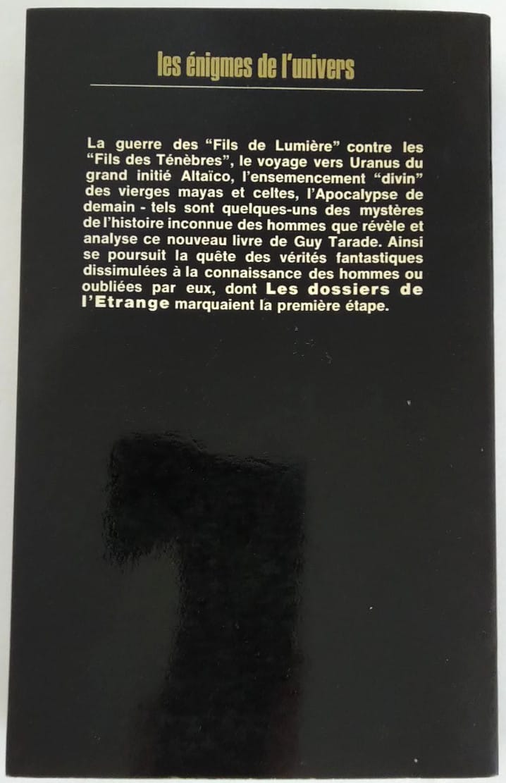 La guerre des « Fils de Lumière » contre les « Fils des Ténèbres », le voyage vers Uranus du grand initié Ataïco, l’ensemencement « divin » des vierges mayas et celtes, l’Apocalypse de demain – tels sont quelques-uns des mystères de l’histoire inconnue des hommes que révèle et analyse ce nouveau livre de Guy Tarade. Ainsi se poursuit la quête des vérités fantastiques dissimulées à la connaissance des hommes ou oubliées par eux, dont les Dossiers de l’Étrange marquaient la première étape.
