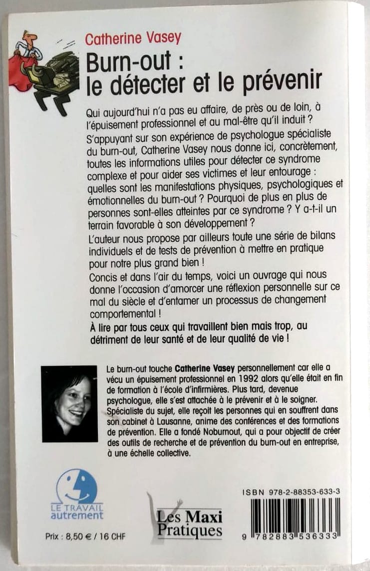 Qui aujourd’hui n’a pas eu affaire, de près ou de loin, à l’épuisement professionnel et au mal-être qu’il induit?. S’appuyant sur son expérience de psychologue spécialiste du burn-out, Catherine Vasey nous donne ici, concrètement, toutes les informations utiles pour détecter ce syndrome complexe et pour aider ses victimes et leur entourage. quelles sont les manifestations physiques, psychologiques et émotionnelles du burn-out ? Pourquoi de plus en plus de personnes sont-elles atteintes par ce syndrome ?Y a-t-il un terrain favorable à son développement?. L’auteur nous propose par ailleurs toute une série de bilans individuels et de tests de prévention à mettre en pratique pour notre plus grand bien !. Concis et dans l’air du temps, voici un ouvrage qui nous donne l’occasion d’amorcer une réflexion personnelle sur ce mal du siècle et d’entamer un processus de changement comportemental !. À lire par tous ceux qui travaillent bien mais trop, au détriment de leur santé et de leur qualité de vie