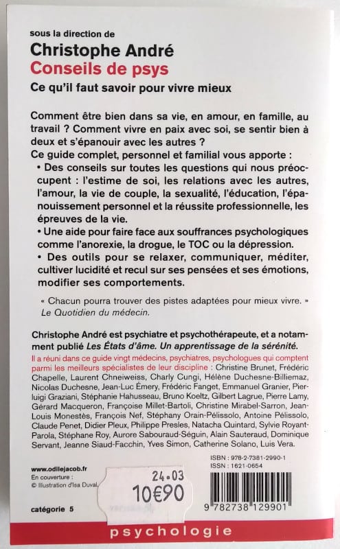 Comment être bien dans sa vie, en amour, en famille, au travail ? Comment vivre en paix avec soi, se sentir bien a deux et s’épanouir avec les autres ? Ce guide informe et donne des conseils sur les questions qui préoccupent chacun d’entre nous: l’estime de soi, les relations avec les autres, l’amour, la vie de couple, la sexualité, l’éducation des enfants, l’épanouissement personnel et la réussite professionnelle, les épreuves de la vie. Il aide aussi a faire face aux souffrances psychologiques, comme l’anorexie, la drogue, le TOC ou la dépression. Il explique comment s’orienter, si besoin, vers une psychothérapie et dans quels cas des médicaments peuvent être nécessaires. Un guide complet, personnel et familial pour s’épanouir et aider son entourage. Des outils pour communiquer, méditer, cultiver lucidite et recul sur ses pensées et ses émotions, modifier ses comportements. Des tests et des conseils concrets pour faire le point et agir. Christophe Andre est psychiatre et psychotherapeute, auteur notamment de Imparfaits, libres et heureux. Il a réuni dans ce guide des médecins, psychiatres et psychologues qui comptent parmi les meilleurs spécialistes: C. Brunet, F. Chapelle, L. Chneiweiss, C. Cungi, H. Duchesne-Billiemaz, N. Duchesne, J.-L. Emery, F. Fanget, E. Granier, P. Graziani, S. Hahusseau, B. Koeltz, G. Lagrue, P. Lamy, G. Macqueron, F. Millet-Bartoli, C. Mirabel-Sarron, J.-L. Monestes, F. Nef, S. Orain-Pelissolo, A. Pelissolo, C. Penet, D. Pleux, P. Presles, N. Quintard, S. Roy, S. Royant-Parola, A. Sabouraud-Seguin, A. Sauteraud, D. Servant, J. Siaud-Facchin, Y. Simon, C. Solano, L. Vera.