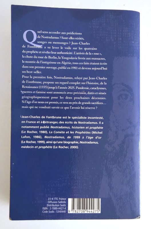 Jean-Charles de Fontbrune est le spécialiste incontesté, en France et à l’étranger, des écrits de Nostradamus. Il a notamment publié Nostradamus, historien et prophète (Le Rocher, 1980), La Comète et les Prophéties (Michel Lafont, 1986), Nostradamus, de 1999 à l’âge d’or (Le Rocher, 1999), ainsi qu’une biographie, Nostradamus, médecin et prophète (Le Rocher, 2000).