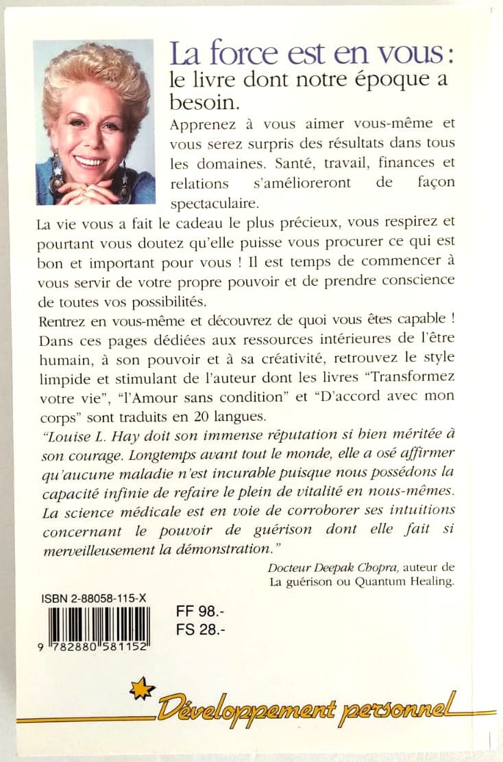Titre : La force est en vous – Thérapeute et conseillère au niveau international depuis de nombreuses années, Louis L. HAY résume volontiers son enseignement par une seule consigne : aimez-vous vous même, vous êtes merveilleux ! De ce principe essentiel découle le bonheur individuel et de proche en proche, la guérison planétaire dont chaque jour qui passe nous confirme davantage la nécessité.