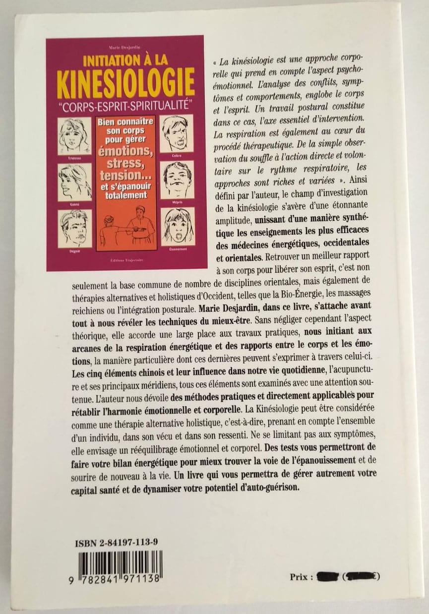 La kinésiologie est une approche corporelle qui prend en compte l’aspect psychoémotionnel. L’analyse des conflits, symptômes et comportements, englobe le corps et l’esprit. Un travail postural constitue dans ce cas, l’axe essentiel d’intervention. La respiration est également au cœur du procédé thérapeutique. De la simple observation du souffle à l’action directe et volontaire sur le rythme respiratoire, les approches sont riches et variées « . Ainsi défini par l’auteur, le champ d’investigation de la kinésiologie s’avère d’une étonnante amplitude, unissant d’une manière synthétique les enseignements les plus efficaces des médecines énergétiques, occidentales et orientales. Retrouver un meilleur rapport à son corps pour libérer sort esprit, c’est non seulement la base commune de nombre de disciplines orientales, mais également de thérapies alternatives et holistiques d’Occident, telles que la Bio-Energie, les massages reichiens ou l’intégration posturale. Marie Desjardin, dans ce livre, s’attache avant tout à nous révéler les techniques du mieux-être. Sans négliger cependant l’aspect théorique, elle accorde une large place aux travaux pratiques, nous initiant aux arcanes de la respiration énergétique et des rapports entre le corps et les émotions, la manière particulière dont ces dernières peuvent s’exprimer à travers celui-ci. Les cinq éléments chinois et leur influence dans notre vie quotidienne, l’acupuncture et ses principaux méridiens, tous ces éléments sont examinés avec une attention soutenue. L’auteur nous dévoile des méthodes pratiques et directement applicables pour rétablir l’harmonie émotionnelle et corporelle. La Kinésiologie peut être considérée comme une thérapie alternative holistique, c’est-à-dire, prenant en compte l’ensemble d’un individu, dans son vécu et dans son ressenti. Ne se limitant pas aux symptômes, elle envisage un rééquilibrage émotionnel et corporel. Des tests vous permettront de faire votre bilan énergétique pour mieux trouver la voie de l’épanouissement et de sourire de nouveau à la vie. Un livre qui vous permettra de gérer autrement votre capital santé et de dynamiser votre potentiel d’auto-guérison.