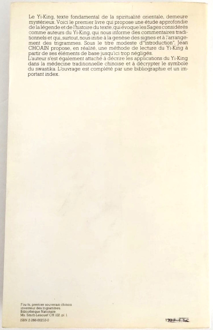 Le Yi-King, texte fondamental de la spiritualité orientale, demeure mystérieux. Ce premier livre propose une étude approfondie de la légende et de l’histoire de ce texte, évoque les Sages considérés comme les auteurs du Yi-King, nous donne le contenu des commentaires traditionnels et, surtout, nous initie à la genèse des signes et à l’arrangement des trigrammes. Sous le titre modeste d’ « Introduction », Jean Choain propose, en réalité, une méthode de lecture du Yi-King à partir de ses éléments de base jusqu’ici trop souvent négligés. L’auteur s’est également attaché à décrire les applications du Yi-King dans la médecine traditionnelle chinoise et à décrypter le symbole du swastika. L’ouvrage est complété par une bibliographie et un important index.