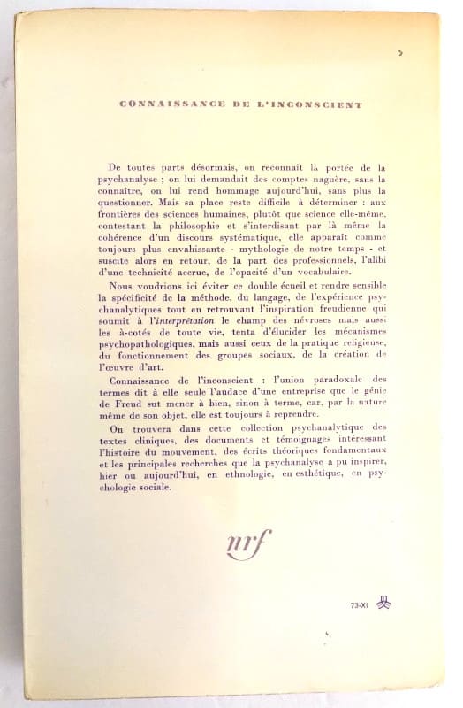 Éditeur : NRF, Gallimard, 1974, collection Connaissance de l’inconscient