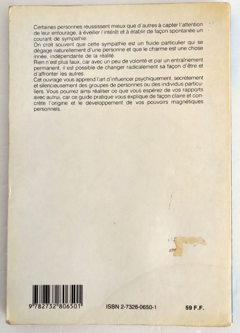 Certaines personnes réussissent mieux que d’autres à capter l’attention de leur entourage, à éveiller l’intérêt et à établir de façon spontanée un courant de sympathie. On croit souvent qu’il s’agit d’un fluide particulier que se dégage naturellement d’une personne et que le charme est une chose innée, indépendante de la réalité. Rien n’est plus faux car, avec un peu de volonté et par un entraînement permanent, il est possible de changer radicalement sa façon d’être et d’affronter les autres. Cet ouvrage vous apprend cet art d’influencer psychiquement, secrètement et silencieusement des groupes de personnes ou des individus particuliers. Vous pourrez ainsi réaliser ce que vous espérez de vos rapports avec autrui, car ce guide pratique vous explique de façon claire et concrète l’origine et le développement de vos pouvoirs magnétiques personnels.