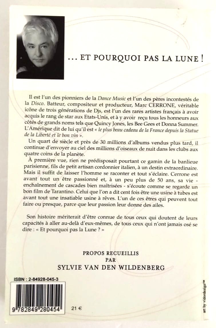 Il est l’un des pionniers de la Dance Music et l’un des pères incontestés de la Disco. Batteur, compositeur et producteur, Marc CERRONE, véritable icône de trois générations de Djs, est l’un des rares artistes français à avoir acquis le rang de star aux Etats-Unis, et à y avoir reçu tous les honneurs aux côtés de grands noms tels que Quincy Jones, les Bee Gees et Donna Summer. L’Amérique dit de lui qu’il est « le plus beau cadeau de la France depuis la Statue de la Liberté et le bon vin ». Un quart de siècle et près de 30 millions d’albums vendus plus tard, il continue d’envoyer au ciel des millions d’oiseaux de nuit dans les clubs aux quatre coins de la planète. À première vue, rien ne prédisposait pourtant ce gamin de la banlieue parisienne, fils de petit artisan cordonnier italien, à un destin extraordinaire. Mais il suffit de laisser l’homme se raconter et tout s’éclaire. Cerrone est avant tout un être passionné et, à un peu plus de 50 ans, sa vie – enchaînement de cascades bien maîtrisées – s’écoute comme se regarde un bon film de Tarantino. Celui que l’on a dit cent fois être une usine à tubes est avant tout une insatiable usine à rêves. L’un de ces êtres qui peuvent tout faire ou presque, parce que leur passion leur donne des ailes. Son histoire mériterait d’être connue de tous ceux qui doutent de leurs capacités à aller au-delà d’eux-mêmes, de tous ceux qui n’ont jamais osé se dire: « Et pourquoi pas la Lune ? »