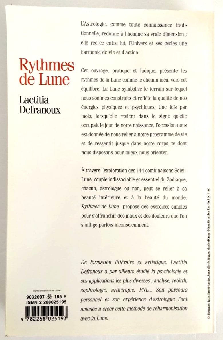 L’Astrologie, comme toute connaissance traditionnelle, redonne à l’homme sa vraie dimension : elle recrée entre lui, l’Univers et ses cycles une harmonie de vie et d’action. Cet ouvrage, pratique et ludique, présente les rythmes de la Lune comme le chemin idéal vers cet équilibre. La Lune symbolise le terrain sur lequel nous sommes construits et reflète la qualité de nos énergies physiques et psychiques. Une fois par mois, lorsqu’elle revient- dans le signe qu’elle occupait le jour de notre naissance, l’occasion nous est donnée de nous relier à notre programme de vie et de ressentir jusque dans notre corps ce dont nous disposons pour mieux nous orienter. À travers l’exploration des 144 combinaisons Soleil-Lune, couple indissociable et essentiel du Zodiaque, chacun, astrologue ou non, peut se relier a sa beauté intérieure, et à la beauté du monde. Rythmes de Lune propose des exercices simples pour s’affranchir des maux et des douleurs que l’on s’inflige parfois inconsciemment.