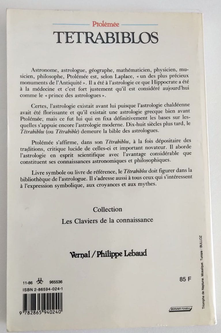Certes, l’astrologie existait avant lui puisque l’astrologie chaldéenne avait été florissante et qu’il existait une astrologie grecque bien avant Ptolémée, mais ce fut lui qui en fixa définitivement les bases sur lesquelles s’appuie encore l’astrologie moderne. Dis-huit siècles plus tard, le Tétrabiblos (ou Tétrabible) demeure la bible des astrologues.