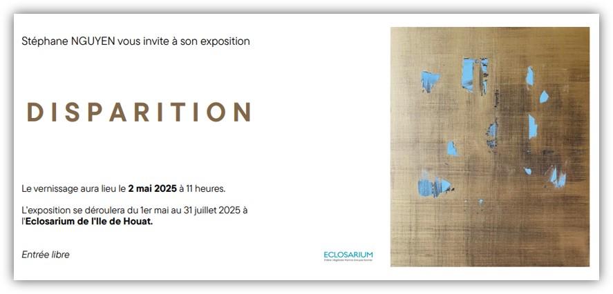 Du 01 mai au 31 juillet 2025, l’Éclosarium de Houat accueille l’exposition « Disparition » de Stéphane NGUYEN.