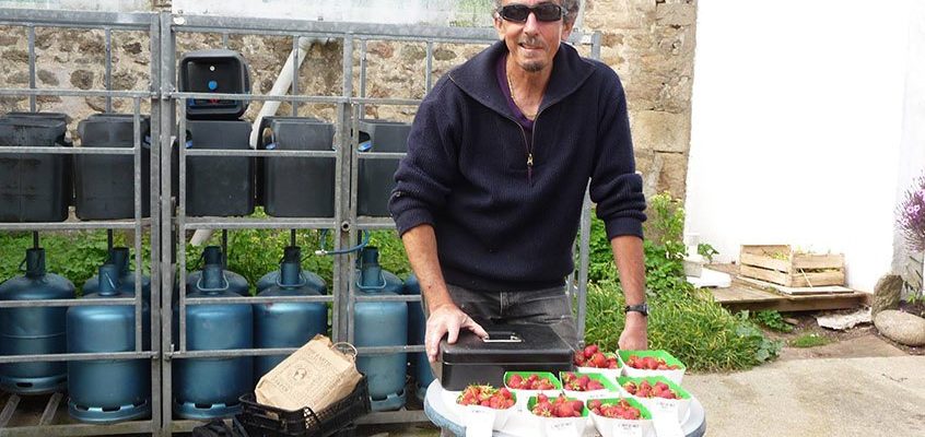 Patrick Le Gurun, marin de la marchande et maraîcher… Patrick Le Gurun, marin de commerce, cultive 3 000 m² sur l’île de Houat. Sa production de fraises alimente les tables de l’île, mais il exporte aussi à Hoëdic et Belle-Ile.