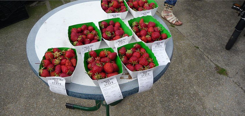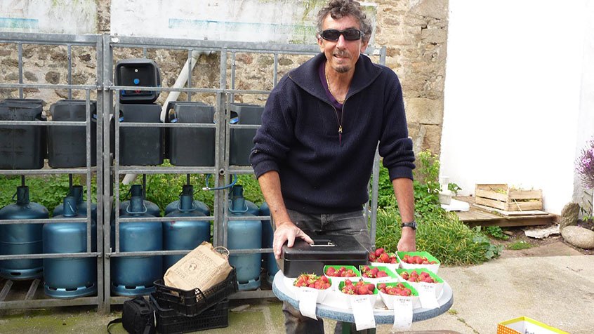 En 2005, il a fait très chaud. Le soleil grille la moitié des 650 fraisiers de l’apprenti maraîcher. Mauvais arrosage. En 2006, il replante. En 2007, il essaye d’autres variétés que la gariguette, met de la manille, de la charlotte, de la mara des bois. Pour amender, il récolte son goémon aux grandes marées de novembre. Avec quelques étoiles de mer, le légume pousse « bio » sans en prendre l’étiquette.