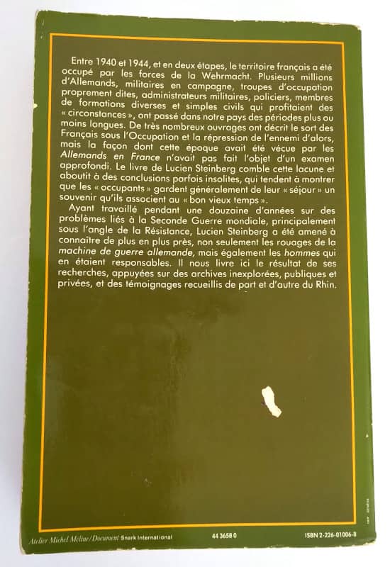 Entre 1940 et 1944, et en deux étapes, le territoire français a été occupé par les forces de la Wehrmacht. Plusieurs millions d’Allemands, militaires en campagne, troupes d’occupation proprement dites, administrateurs militaires, policiers, membres de formations diverses et simples civils qui profitaient des « circonstances », ont passé dans notre pays des périodes plus ou moins longues. De très nombreux ouvrages ont décrit le sort des Français sous l’Occupation et la répression de l’ennemi d’alors, mais la façon dont cette époque avait été vécue par les Allemands en France n’avait pas fait l’objet d’un examen approfondi. Le livre de Lucien Steinberg comble cette lacune et aboutit à des conclusions parfois insolites, qui tendent à montrer que les « occupants » gardent généralement de leur « séjour » un souvenir qu’ils associent au « bon vieux temps ». Ayant travaillé pendant une douzaine d’années sur des problèmes liés à la Seconde Guerre mondiale, principalement sous l’angle de la Résistance, Lucien Steinberg a été amené à connaître de plus en plus près, non seulement les rouages de la machine de guerre allemande, mais également les hommes qui en étaient responsables. Il nous livre ici le résultat de ses recherches, appuyées sur des archives inexplorées, publiques et privées, et des témoignages recueillis de part et d’autre du Rhin.