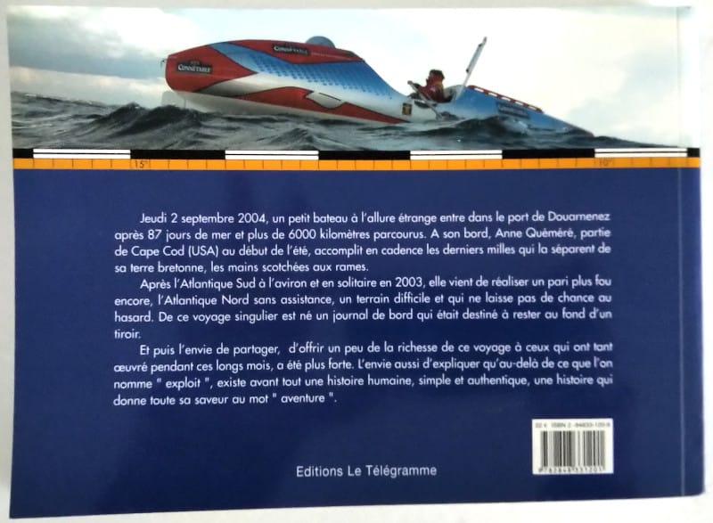 Jeudi 2 septembre 2004, un petit bateau à l’allure étrange entre dans le port de Douarnenez après 87 jours de mer et plus de 6000 kilomètres parcourus. A son bord, Anne Quéméré, partie de Cape Cod (USA) au début de l’été, accomplit en cadence les derniers milles qui la séparent de sa terre bretonne, les mains scotchées aux rames. Après l’Atlantique Sud à l’aviron et en solitaire en 2003, elle vient de réaliser un pari plus fou encore, l’Atlantique Nord sans assistance, un terrain difficile et qui ne laisse pas de chance au hasard. De ce voyage singulier est né un journal de bord qui était destiné à rester au fond d’un tiroir. Et puis l’envie de partager, d’offrir un peu de la richesse de ce voyage à ceux qui ont tant œuvré pendant ces longs mois, a été plus forte. L’envie aussi d’expliquer qu’au-delà de ce que l’on nomme » exploit « , existe avant tout une histoire humaine, simple et authentique, une histoire qui donne toute sa saveur au mot » aventure « .