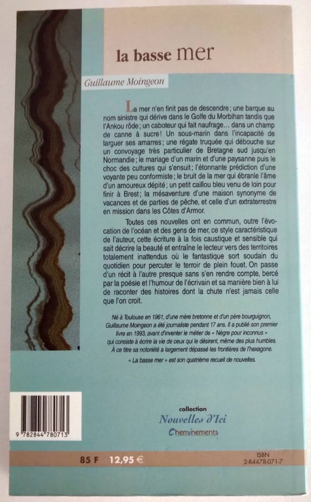 La mer n’en finit pas de descendre ; une barque au nom sinistre qui dérive dans le Golfe du Morbihan tandis que l’Ankou rôde ; un caboteur qui fait naufrage… dans un champ de canne à sucre ! Un sous-marin dans l’incapacité de larguer ses amarres ; une régate truquée qui débouche sur un convoyage très particulier de Bretagne sud jusqu’en Normandie ; le mariage d’un marin et d’une paysanne puis le choc des cultures qui s’ensuit ; l’étonnante prédiction d’une voyante peu conformiste ; le bruit de la mer qui ébranle l’âme d’un amoureux dépité ; un petit caillou bleu venu de loin pour finir à Brest ; la mésaventure d’une maison synonyme de vacances et de parties de pêche, et celle d’un extraterrestre en mission dans les Côtes d’Armor. Toutes ces nouvelles ont en commun, outre l’évocation de l’océan et des gens de mer, ce style caractéristique de l’auteur, cette écriture à la fois caustique et sensible qui sait décrire la beauté et entraîne le lecteur vers des territoires totalement inattendus où le fantastique sort soudain du quotidien pour percuter le terroir de plein fouet. On passe d’un récit à l’autre presque sans s’en rendre compte, bercé par la poésie et l’humour de l’écrivain et sa manière bien à lui de raconter des histoires dont la chute n’est jamais celle que l’on croit.