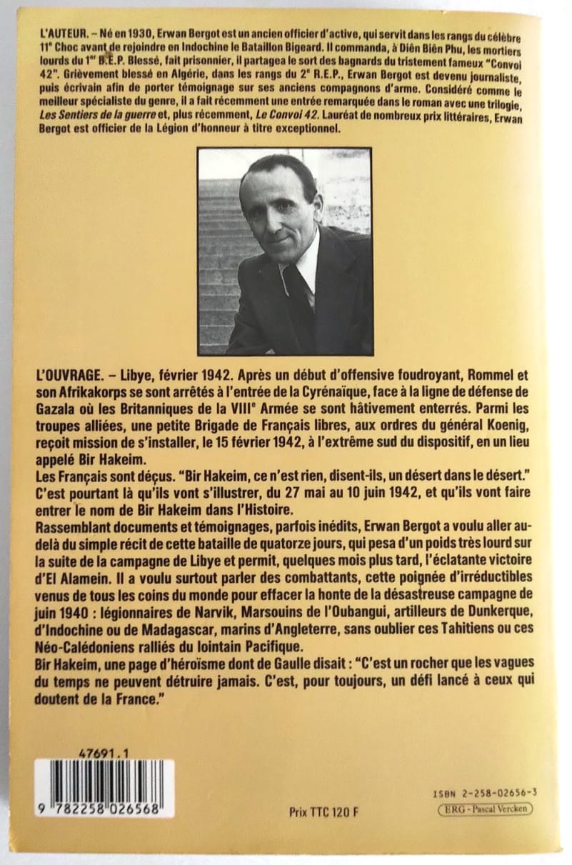 Libye, février 1942. Après un début d’offensive foudroyant, Rommel et son Afrikakorps se sont arrêtés à l’entrée de la Cyrénaïque, face à la ligne de défense de Gazala où les Britanniques de la VIIIe armée se sont hâtivement enterrés. Parmi les troupes alliées, une petite brigade de Français libres, aux ordres du général Kœnig, reçoit mission de s’installer, le 15 février 1942, à l’extrême sud du dispositif, en un lieu appelé Bir Hakeim. Les Français sont déçus. » Bir Hakeim, ce n’est rien, disent-ils, un désert dans le désert. » C’est pourtant là qu’ils vont s’illustrer, du 27 mai au 10 juin 1942, et qu’ils vont faire entrer le nom de Bir Hakeim dans l’Histoire. Rassemblant documents et témoignages, parfois inédits, Erwan Bergot a voulu aller au-delà du simple récit de cette bataille de quatorze jours, qui pesa d’un poids très lourd sur la suite de la campagne de Libye et permit, quelques mois plus tard, l’éclatante victoire d’El-Alamein. Il a surtout voulu parler des combattants, cette poignée d’irréductibles venus de tous les coins du monde pour effacer la honte de la désastreuse campagne de juin 1940 : légionnaires de Narvik, marsouins de l’Oubangui, artilleurs de Dunkerque, d’Indochine ou de Madagascar, marins d’Angleterre, sans oublier ces Tahitiens ou ces Néo-Calédoniens ralliés du lointain Pacifique. Bir Hakeim, une page d’héroïsme dont de Gaulle disait : » C’est un rocher que les vagues du temps ne peuvent détruire jamais. C’est, pour toujours, un défi lancé à ceux qui doutent de la France. »