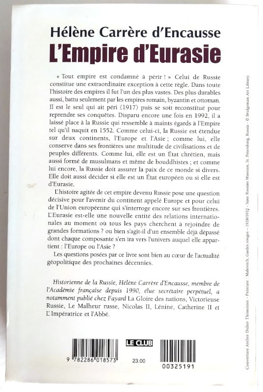 » Tout empire est condamné à périr ! » Celui de Russie constitue une extraordinaire exception à cette règle. Dans toute l’histoire des empires il fut l’un des plus vastes. Des plus durables aussi, battu seulement par les empires romain, byzantin et ottoman. Il est le seul qui ait péri (1917) puis se soit reconstitué pour reprendre ses conquêtes. Disparu encore une fois en 1992, il a laissé place à la Russie qui ressemble à maints égards à l’Empire tel qu’il naquit en 1552. Comme celui-ci, la Russie est étendue sur deux continents, l’Europe et l’Asie ; comme lui, elle conserve dans ses frontières une multitude de civilisations et de peuples différents. Comme lui, elle est un État chrétien, mais aussi formé de musulmans et même de bouddhistes ; et comme lui encore, la Russie doit assurer la paix de ce monde si divers. Elle doit aussi décider si elle est un État européen ou si elle est d’Eurasie. L’histoire agitée de cet empire devenu Russie pose une question décisive pour l’avenir du continent appelé Europe et pour celui de l’Union européenne qui s’interroge encore sur ses frontières. L’Eurasie est-elle une nouvelle entité des relations internationales au moment où tous les pays cherchent à rejoindre de grandes formations ? ou bien s’agit-il d’un ensemble déjà dépassé dont chaque composante s’en ira vers l’univers auquel elle appartient : l’Europe ou l’Asie ? Les questions posées par ce livre sont bien au cœur de l’actualité géopolitique des prochaines décennies.