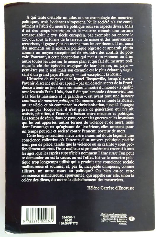 A qui tente d’établir un atlas et une chronologie des meurtres politiques, trois évidences s’imposent. Nulle société n’a été continûment à l’abri du meurtre politique sous ses aspects divers. Mais il est des temps historiques où le meurtre connaît une fortune remarquable: le XVIe siècle européen, par exemple; ou encore le XXe, où, sous la forme de la terreur de masse et des mouvements terroristes, il gagne plus ou moins tous les continents. Il est aussi des moments où le meurtre politique régresse et apparaît plutôt comme un moyen exceptionnel de résoudre des conflits de pouvoir. Pourtant, à cette conception qui met à un moment ou à un autre toutes les cités sur le même plan et qui fait du meurtre politique la clé des épisodes tragiques de leur histoire, un pays _ peut-être pas le seul, mais son exemple est le plus éclatant, s’agissant d’un grand pays d’Europe _ fait exception: la Russie.