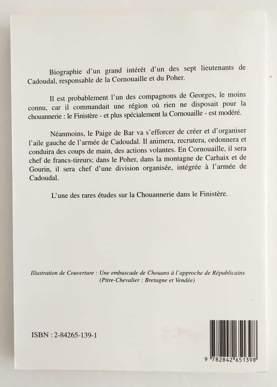 Titre : Un lieutenant de Cadoudal : Jean-François-Edme LE PAIGE de BAR lieutenant de Cadoudal – La chouannerie en Cornouaille et dans le Poher, les Presses Bretonnes, St Brieuc, 1962