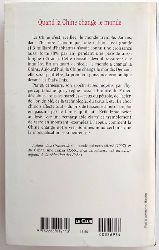 La Chine s’est réveillée, le monde tremble. Jamais, dans l’histoire économique, une nation aussi grande (1,3 milliard d’habitants) n’avait connu une croissance aussi forte (8% par an) pendant une période aussi longue (vingt-cinq ans). Cette réussite devrait rassurer : elle inquiète. En un quart de siècle, le monde a changé la Chine. Aujourd’hui, la Chine change le monde. Demain, elle sera, peut-être, la première puissance économique devant les États-Unis.