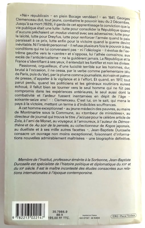 » Né » républicain – en plein Bocage vendéen ! – en 1841, Georges Clemenceau dut, tout jeune, combattre le pouvoir issu du 2 Décembre. Jusqu’à sa mort (1929), il garda de cet apprentissage la conviction que la vie publique était une lutte : lutte pour consolider la République quand d’aucuns prêchaient un modus vivendi avec ses adversaires, lutte pour la laïcité, lutte pour Dreyfus, lutte pour renforcer l’armée quand la paix paraissait à ce prix, lutte enfin pour la victoire quand la guerre devint inévitable. Ni l’intérêt personnel – il refusa plusieurs fois le pouvoir à des conditions qui ne lui convenaient pas – ni l’idéologie – il évolua de l’extrême gauche vers le » centre » et s’opposa, lui l’athée convaincu, aux excès de l’anticléricalisme – ne le guidèrent jamais. La République et la France s’identifiant à ses yeux, il entendait les fortifier et non les diviser. Passionné, orgueilleux, d’une lucidité terrible sur les hommes, dur, brutal à l’occasion, il ne cessa, par le verbe comme parlementaire (élu de Paris, puis du Var), par la plume comme journaliste, écrivain et patron de presse, d’appeler à la vigilance et à l’effort. Et quand, en 1917, tout parut perdu, quand les politiciens et les généraux routiniers eurent échoué, il fallut bien se tourner vers le seul homme qui ne fût pas compromis dans les expériences antérieures, le seul aussi dont la combativité et l’ardeur fussent inentamées en dépit de l’âge – soixante-seize ans ! – : Clemenceau. C’est lui, on le sait, qui mena le pays à la victoire, mettant un terme à d’indicibles souffrances. A cet homme exceptionnel – au jeune médecin des pauvres, au maire de Montmartre sous la Commune, au tombeur de ministères « , au directeur de journal qui trouva le titre J’accuse ! pour le célèbre article de Zola, à l’ami de Monet, au voyageur, à l’amoureux, à l’auteur de Démosthène et de Au soir de la pensée, au collectionneur de Kogos japonais, au duelliste et à ses mille autres facettes -, Jean-Baptiste Duroselle a consacré un ouvrage non moins exceptionnel, foisonnant d’informations nouvelles admirablement maîtrisées – une biographie définitive.