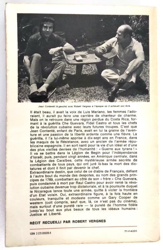 Il était beau, il avait la voix de Luis Mariano, les femmes l’adoraient, il aurait pu faire une carrière de chanteur de charme. Mais on le retrouve dans une région perdue du Costa Rica, formant à la guérilla Che Guevara, Fidel Castro et tous les chefs de la révolution cubaine avec leurs futures troupes. C’est que Jean Contenté, enfant de Paris, avait en lui la graine de l’aventure et une passion de la liberté ardente comme une fièvre. La guérilla, il l’a lui-même apprise à dix-sept ans en France, dans les maquis de la Résistance, avec un ancien de l’armée républicaine espagnole. Il en sort nanti pour la vie d’un idéal et d’une des plus vieilles devises de l’humanité : « Guerre aux tyrans ! » Il va se battre dans la Légion de Begin pour l’indépendance d’Israël, puis, pendant vingt années, en Amérique centrale, dans la Légion des Caraïbes, cette mystérieuse armée secrète de combattants de tous pays, qui ont juré là-bas la mort des dictatures et dont il finit par devenir le chef. Extraordinaire destin, que celui de ce diable de Français, défiant à l’autre bout du monde des despotes, au nom des grands principes de 1789, combattant au côté de son « frère » Che Guevara, puis condamné à mort par Raul Castro pour avoir renié la révolution cubaine devenue trop dictatoriale, et à la poursuite duquel le Nicaragua lance toute une armée, quitte à violer la frontière d’un Etat voisin. Oui, extraordinaire figure, à la fois haute en couleurs, tranquille et modeste comme un Gary Cooper de western (colt compris, sauf que, là, ce n’est pas du cinéma), mais surtout d’une pureté rare — la pureté de l’homme fidèle jusqu’au bout aux plus beaux de tous les idéaux humains : Justice et Liberté.