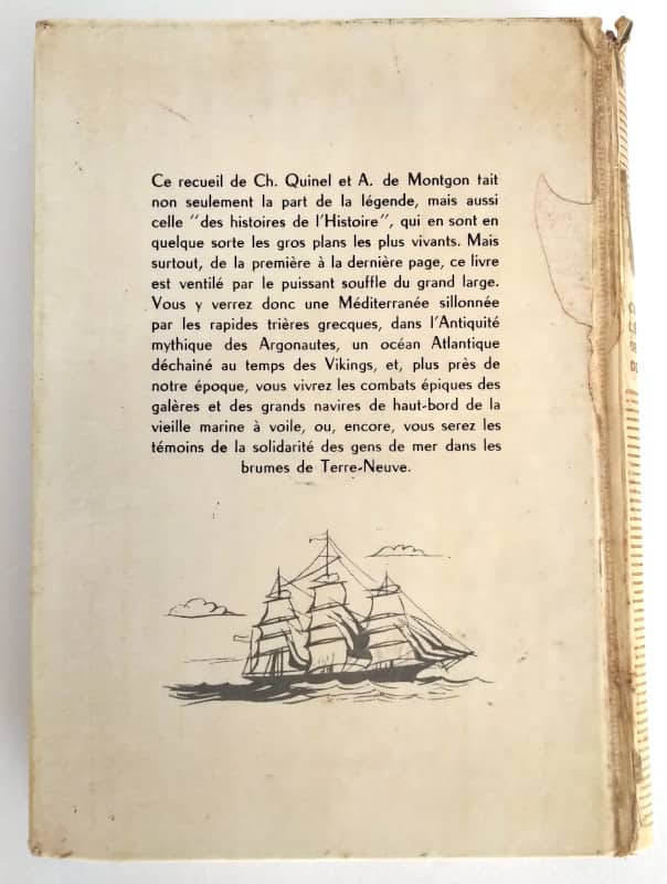 Ce recueil de Ch. Quinel et A.de Montgon fait non seulement la part de la légende, mais aussi celle « des histoires de l’Histoire », qui en sont en quelque sorte les gros plans les plus vivants. Mais surtout, de la première à la dernière page, ce livre est ventilé par le puissant souffle du grand large. Vous y verrez donc une Méditerranée sillonnée par les rapides trières grecques, dans l’Antiquité mythique des Argonautes, un océan Atlantique déchaîné au temps des Vikings, et, plus près de notre époque, vous vivrez les combats épiques des galères et des grands navires de haut-bord de la vieille marine à voile, ou, encore vous serez les témoins de la solidarité des gens de mer dans les brumes de Terre-Neuve.