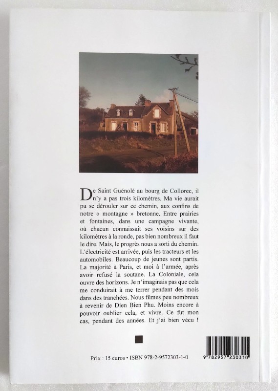 De Saint Guénolé au bourg de Collorec, il n’y a pas trois kilomètres. Ma vie aurait pu se dérouler sur ce chemin, aux confins de notre « montagne » bretonne. Entre prairies et fontaines, dans une campagne vivante, où chacun connaissait ses voisins sur des kilomètres à la ronde, pas bien nombreux il faut le dire. Mais, le progrès nous a sorti du chemin. L’électricité est arrivée, puis les tracteurs et les automobiles. Beaucoup de jeunes sont partis. La majorité à Paris, et moi à l’armée, après avoir refusé la soutane. La Coloniale, cela ouvre des horizons. Je n’imaginais pas que cela me conduirait à me terrer pendant des mois dans des tranchées. Nous fûmes peu nombreux à revenir de Dien Bien Phu. Moins encore à pouvoir oublier cela, et vivre. Ce fut mon cas, pendant des années. Et j’ai bien vécu !