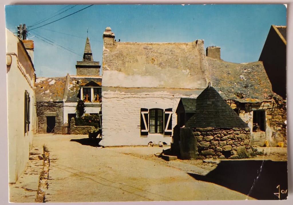 Vue couleur d'une rue (nord) du village de Houat (radjel) et de l'église Saint-Gildas