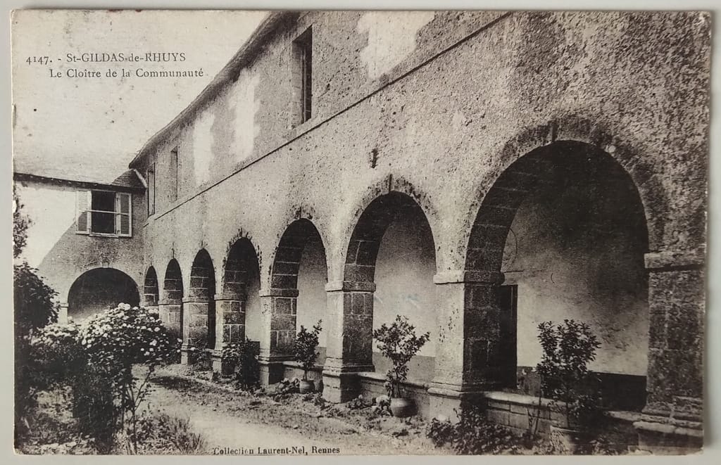 Vue couleur d'une rue (nord) du village de Houat (radjel) et de l'église Saint-Gildas