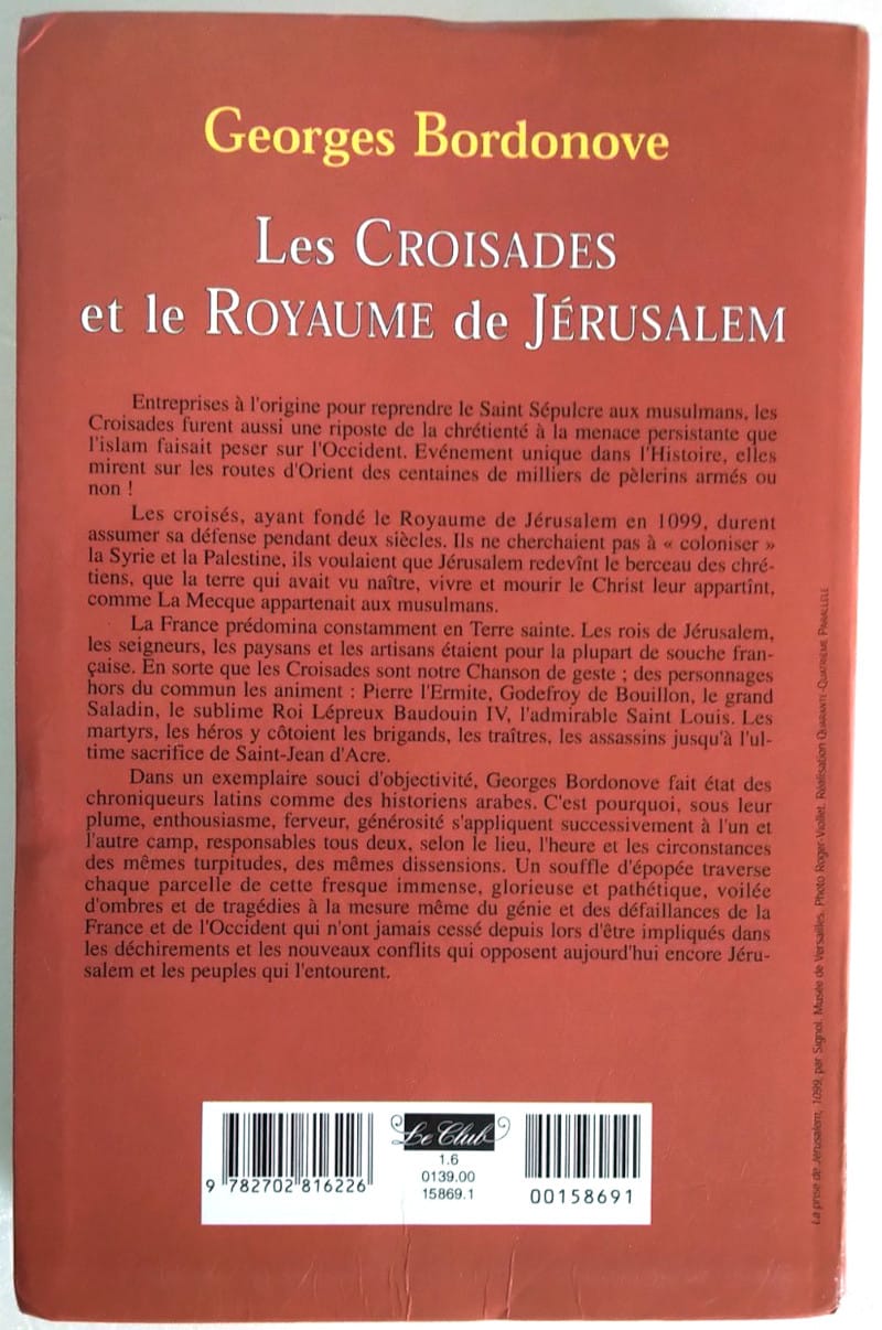 Dans un exemplaire souci d’objectivité, Georges Bordonove fait état des chroniqueurs latins comme des historiens arabes. C’est pourquoi, sous leur plume, enthousiasme, ferveur, générosité s’appliquent successivement à l’un et l’autre camp, responsables tous deux, selon le lieu, l’heure et les circonstances des mêmes turpitudes, des mêmes dissensions. Un souffle d’épopée traverse chaque parcelle de cette fresque immense, glorieuse et pathétique, voilée d’ombres et de tragédies à la mesure même du génie et des défaillances de la France et de l’Occident qui n’ont jamais cessé depuis lors d’être impliqués dans les déchirements et les nouveaux conflits qui opposent aujourd’hui encore Jérusalem et les peuples qui l’entourent.
