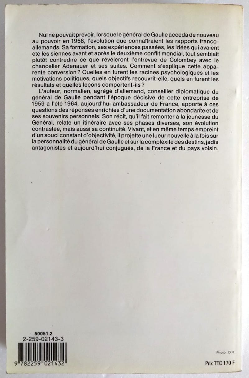 Nul ne pouvait prévoir, lorsque le général de Gaulle accéda de nouveau au pouvoir en 1958, l’évolution que connaîtraient les rapports franco-allemands. Sa formation, ses expériences passées, les idées qui avaient été les siennes avant et après le deuxième conflit mondial, tout semblait plutôt contredire ce que révéleront l’entrevue de Colombey avec le chancelier Adenauer et ses suites. Comment s’explique cette apparente conversion ? Quelles en furent les racines psychologiques et les motivations politiques, quels objectifs recouvrit-elle, quels en furent les résultats et quelles leçons comportent-ils ? L’auteur, normalien, agrégé d’allemand, conseiller diplomatique du général de Gaulle pendant l’époque décisive de cette entreprise de 1959 à l’été 1964, aujourd’hui ambassadeur de France, apporte à ces questions des réponses enrichies d’une documentation abondante et de ses souvenirs personnels. Son récit, qu’il fait remonter à la jeunesse du Général, relate un itinéraire avec ses phases diverses, son évolution contrastée, mais aussi sa continuité. Vivant, et en même temps empreint d’un souci constant d’objectivité, il projette une lueur nouvelle à la fois sur la personnalité du général de Gaulle et sur la complexité des destins, jadis antagonistes et aujourd’hui conjugués, de la France et du pays voisin.