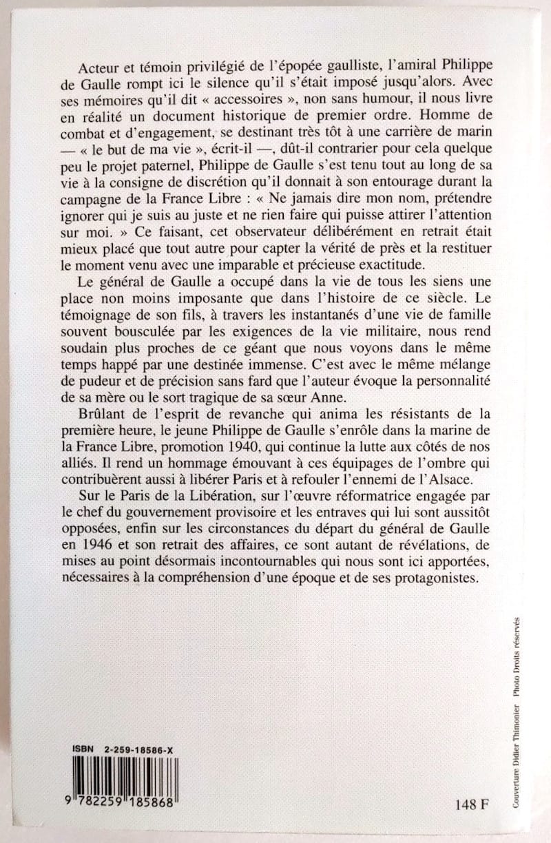 Acteur et témoin privilégié de l’épopée gaulliste, l’amiral Philippe de Gaulle rompt ici le silence qu’il s’était imposé jusqu’alors. Aves ses mémoires qu’il dit » accessoires « , non sans humour, il nous livre en réalité un document historique de premier ordre. Homme de combat et d’engagement, se destinant très tôt à une carrière de marin – » le but de ma vie « , écrit-il – dût-il contrarier pour cela quelque peu le projet paternel, Philippe de Gaulle s’est tenu tout au long de sa vie à la consigne de discrétion qu’il donnait à son entourage durant la campagne de la France Libre : » Ne jamais dire mon nom, prétendre ignorer qui je suis au juste et ne rien faire qui puisse attirer l’attention sur moi. » Ce faisant, cet observateur délibérément en retrait était mieux placé que tout autre pour capter la vérité de près et la restituer le moment venu avec une imparable et précieuse exactitude.