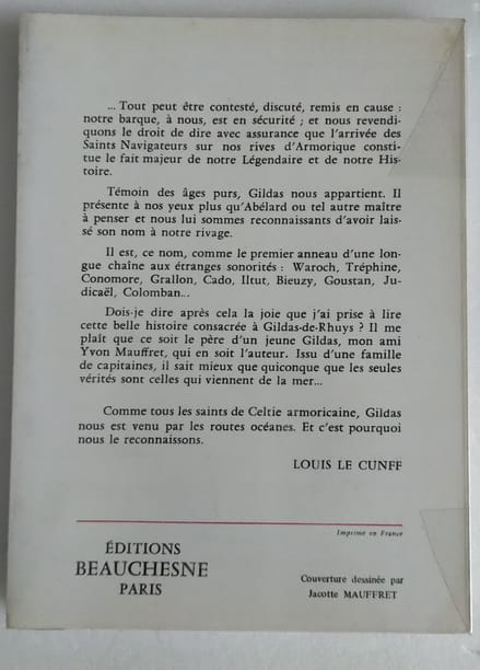 Dois-je dire après cela la joie que j’ai prise à lire cette belle histoire consacrée à Gildas-de-Rhuys ? Il me plait que ce soit le père d’un jeune Gildas, mon ami Yvon Mauffret, qui en soit l’auteur. Issu d’une famille de capitaines, il sait mieux que quiconque que les seules vérités sont celles qui viennent de la mer…