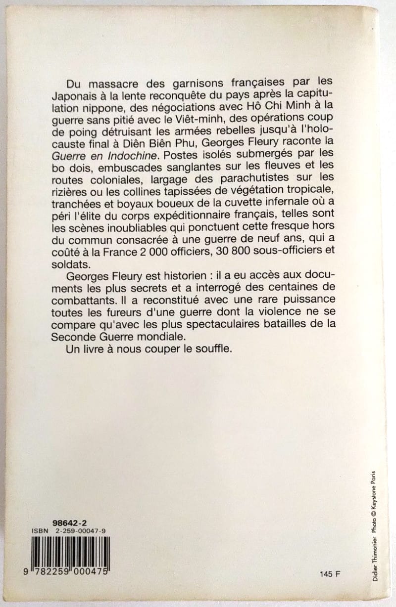 Du massacre des garnisons françaises par les Japonais à la lente reconquête du pays après la capitulation nippone, des négociations avec Hô Chi Minh à la guerre sans pitié avec le Viêt-minh, des opérations coup de poing détruisant les armées rebelles jusqu’à l’holocauste final à Diên Biên Phu, Georges Fleury raconte La Guerre en Indochine, cette fresque hors du commun consacrée à un conflit de neuf ans, qui coûta à la France 2 000 officiers, 30 800 sous-officiers et soldats, où périt l’élite du corps expéditionnaire français.