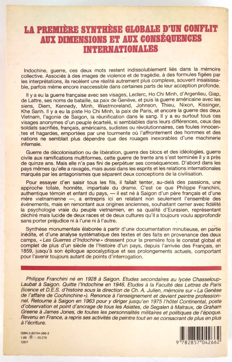 Indochine, guerre, ces deux mots restent indissolublement liés dans la mémoire collective. Associés à des images de violence et de tragédie, à des clichés figés par les interprétations, ils recèlent une réalité autrement plus complexe, souvent insaisissable. Il y a eu la guerre française avec ses visages, Leclerc, Ho Chi Minh, d’Argenlieu, Giap, de Lattre, ses noms de bataille, sa paix de Genève, et puis la guerre américaine avec les siens, Diem, Kennedy, Minh, Westmoreland, Johnson, Thieu, Nixon, Kissinger, Khe Sanh. Il y a eu la piste Ho Chi Minh, la paix de Paris, et encore la guerre des deux Vietnam, l’agonie de Saigon, la réunification dans le sang. Il y a eu surtout tous ces visages anonymes d’un peuple écartelé, si semblables dans leurs différences, ceux des soldats sacrifiés, français, américains, sudistes ou révolutionnaires, ces foules innocentes et hagardes, emportées par une tourmente…