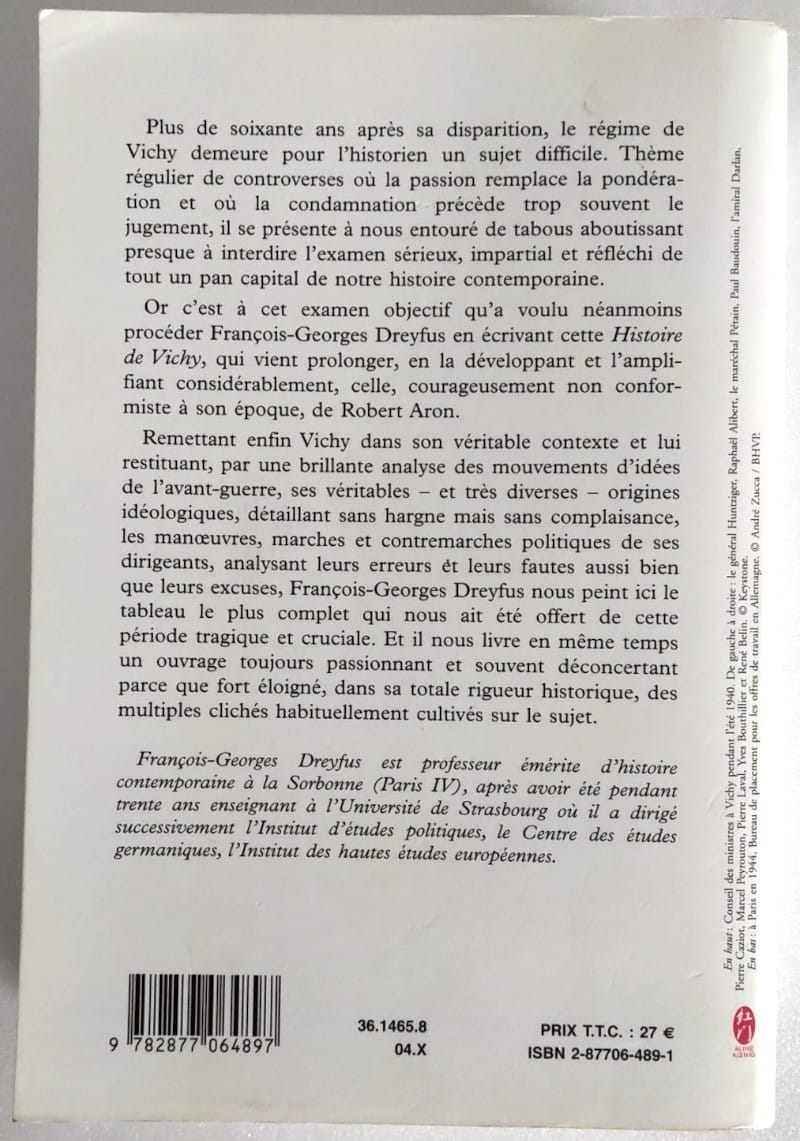 Plus de soixante ans après sa disparition, le régime de Vichy demeure pour l’historien un sujet difficile. Thème régulier de controverses où la passion remplace la pondération et où la condamnation précède trop souvent le jugement, il se présente à nous entouré de tabous aboutissant presque à interdire l’examen sérieux, impartial et réfléchi de tout un pan capital de notre histoire contemporaine. Or c’est à cet examen objectif qu’a voulu néanmoins procéder François-Georges Dreyfus en écrivant cette Histoire de Vichy, qui vient prolonger, en la développant et l’amplifiant considérablement, celle, courageusement non conformiste à son époque, de Robert Aron. Remettant enfin Vichy dans son véritable contexte et lui restituant, par une brillante analyse des mouvements d’idées de l’avant-guerre, ses véritables – et très diverses – origines idéologiques, détaillant sans hargne mais sans complaisance, les manœuvres, marches et contremarches politiques de ses dirigeants, analysant leurs erreurs et leurs fautes aussi bien que leurs excuses, François-Georges Dreyfus nous peint ici le tableau le plus complet qui nous ait été offert de cette période tragique et cruciale. Et il nous livre en même temps un ouvrage toujours passionnant et souvent déconcertant parce que fort éloigné, dans sa totale rigueur historique, des multiples clichés habituellement cultivés sur le sujet.