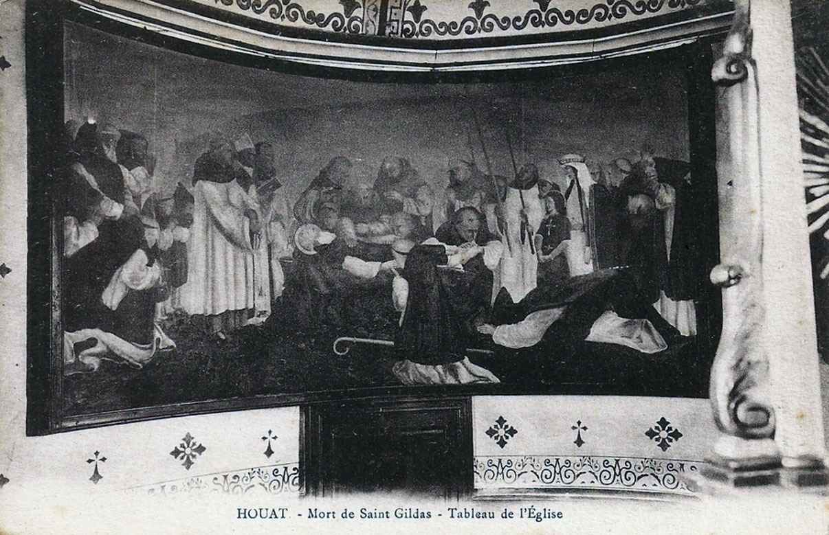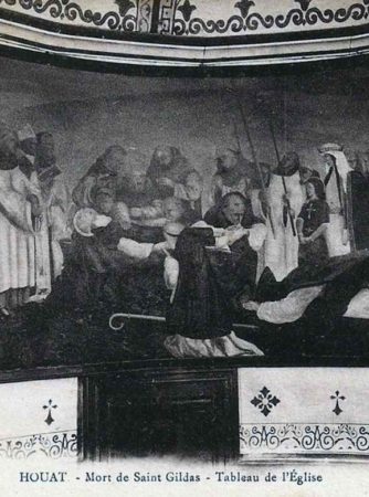 Vue noir et blanc du tableau de la mort de Saint-Gildas dans le choeur de l'église Saint-Gildas de Houat