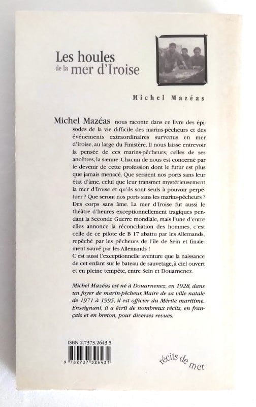 Michel Mazéas nous raconte dans ce livre des épisodes de la vie difficile des marins-pêcheurs et des événements extraordinaires survenus en mer d’Iroise, au large du Finistère. Il nous laisse entrevoir la pensée de ces marins-pêcheurs, celles de ses ancêtres, la sienne. Chacun de nous est concerné par le devenir de cette profession dont le futur est plus que jamais menacé. Que seraient nos ports sans leur état d’âme, celui que leur transmet mystérieusement la mer d’Iroise et qu’ils sont seuls à pouvoir perpétuer ? Que seront nos ports sans les marins-pêcheurs ? Des corps sans âme. La mer d’Iroise fut aussi le théâtre d’heures exceptionnellement tragiques pendant la Seconde Guerre mondiale, mais l’une d’entre elles annonce la réconciliation des hommes, c’est celle de ce pilote de B17 abattu par les Allemands, repêché par les pêcheurs de l’île de Sein et finalement sauvé par les Allemands ! C’est aussi l’exceptionnelle aventure que la naissance de cet enfant sur le bateau de sauvetage, à ciel ouvert et en pleine tempête, entre Sein et Douarnenez.