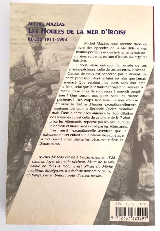 Michel Mazéas nous raconte dans ce livre des épisodes de la vie difficile des marins-pêcheurs et des événements extraordinaires survenus en mer d’Iroise, au large du Finistère. Il nous laisse entrevoir la pensée de ces marins-pêcheurs, celles de ses ancêtres, la sienne. Chacun de nous est concerné par le devenir de cette profession dont le futur est plus que jamais menacé. Que seraient nos ports sans leur état d’âme, celui que leur transmet mystérieusement la mer d’Iroise et qu’ils sont seuls à pouvoir perpétuer ? Que seront nos ports sans les marins-pêcheurs ? Des corps sans âme. La mer d’Iroise fut aussi le théâtre d’heures exceptionnellement tragiques pendant la Seconde Guerre mondiale, mais l’une d’entre elles annonce la réconciliation des hommes, c’est celle de ce pilote de B17 abattu par les Allemands, repêché par les pêcheurs de l’île de Sein et finalement sauvé par les Allemands ! C’est aussi l’exceptionnelle aventure que la naissance de cet enfant sur le bateau de sauvetage, à ciel ouvert et en pleine tempête, entre Sein et Douarnenez.