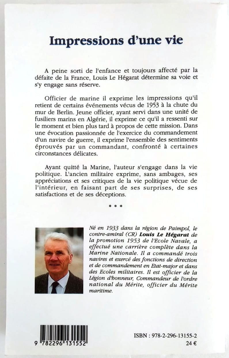 A peine sorti de l’enfance et toujours affecté par la défaite de la France, le contre-amiral (CR) Louis Le Hégarat détermine sa voie et s’y engage sans réserve. Officier de marine, il exprime les impressions qu’il retient de certains événements vécus de 1953 à la chute du mur de Berlin. Ayant servi dans une unité de fusiliers marins en Algérie, il dit ce qu’il a ressenti sur le moment et bien plus tard à l’occasion de cette mission. Ayant quitté la Marine, l’auteur s’engage dans la vie politique. L’ancien militaire exprime, sans ambages, ses appréciations de la vie politique vécue de l’intérieur.