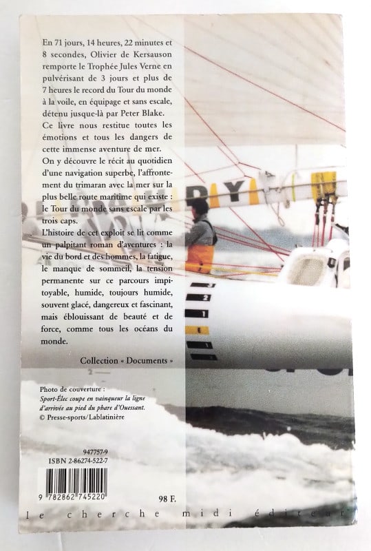 En 71 jours, 14 heures, 22 minutes et 8 secondes, Olivier de Kersauson remporte le Trophée Jules Verne en pulvérisant de 3 jours et plus de 7 heures le record du Tour du monde à la voile, en équipage et sans escale, détenu jusque-là par Peter Blake. Ce livre nous restitue toutes les émotions et tous les dangers de cette immense aventure de mer. On y découvre le récit au quotidien d’une navigation superbe, l’affrontement du trimaran avec la mer sur la plus belle route maritime qui existe : le Tour du monde sans escale par les trois caps. » L’histoire de cet exploit se lit comme un palpitant roman d’aventures : la vie du bord et des hommes, la fatigue, le manque de sommeil, la tension permanente sur ce parcours impitoyable, humide, toujours humide, souvent glacé, dangereux et fascinant, mais éblouissant de beauté et de force, comme tous les océans du monde.