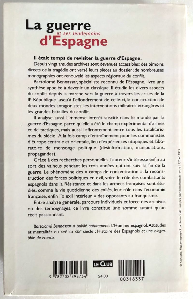 Bartolomé Bennassar, spécialiste reconnu de l’Espagne, livre une synthèse appelée à devenir un classique. Il étudie les divers aspects du conflit depuis la marche vers la guerre à travers les crises de la IIe République jusqu’à l’effondrement de celle-ci, la construction de deux mondes antagonistes, les interventions militaires étrangères et les grandes batailles du conflit.