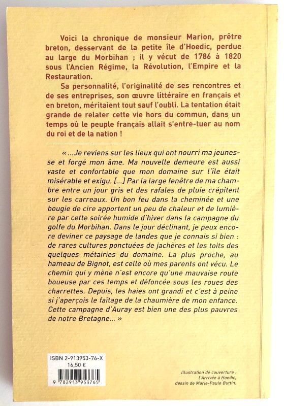 Marie-Paule BUTTIN relate la vie hors du commun du prêtre breton Marion pendant son ministère dans la petite île d’Hoedic au large du Morbihan ; il y vécut de 1786 à 1820 sous l’Ancien Régime, la Révolution, l’Empire et la Restauration. Sa personnalité, l’originalité de ses rencontres et de ses entreprises, son oeuvre littéraire en français et en breton.