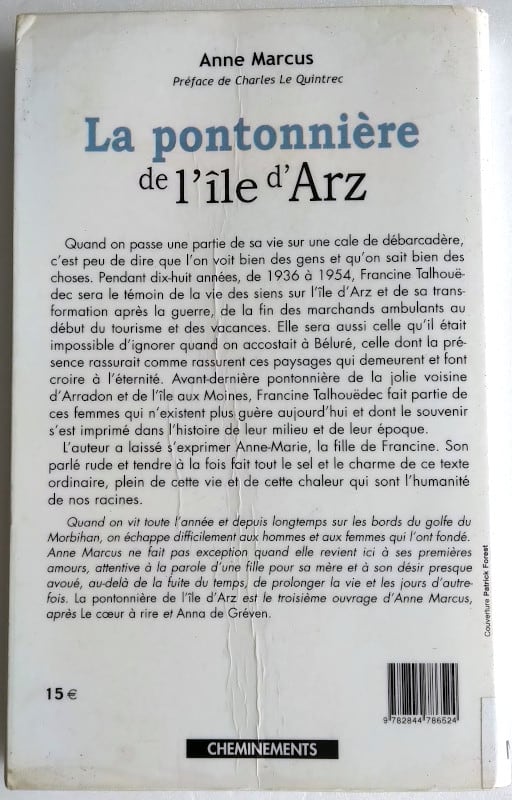Quand on passe une partie de sa vie sur une cale de débarcadère, c’est peu de dire que l’on voit bien des gens et qu’on sait bien des choses. Pendant dix-huit années, de 1936 à 1954, Francine Talhouëdec sera le témoin de la vie des siens sur l’île d’Arz et de sa transformation après la guerre, de la fin des marchands ambulants au début du tourisme et des vacances.