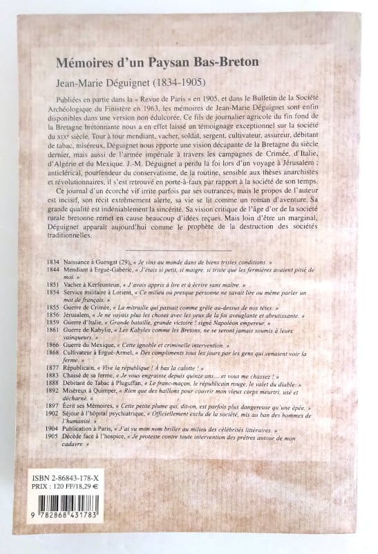 Publiées en partie dans La Revue de Paris en 1905, et dans le Bulletin de la Société Archéologique du Finistère en 1963, les Mémoires de Jean-Marie Déguignet sont enfin disponibles dans une version non édulcorée. Ce fils de journalier agricole du fin fond de la Bretagne bretonnante nous a en effet laissé un témoignage exceptionnel sur la société du XIXe siècle. Tour à tour mendiant, vacher, soldat, sergent, cultivateur, assureur, débitant de tabac, miséreux, Déguignet nous apporte une vision décapante de la Bretagne du siècle dernier. mais aussi de l’armée impériale à travers les campagnes de Crimée, d’Italie, d’Algérie et du Mexique. J.-M. Déguignet a perdu la foi lors d’un voyage à Jérusalem ; anticlérical, pourfendeur du conservatisme, de la routine, sensible aux thèses anarchistes et révolutionnaires, il s’est retrouvé en porte-à-faux par rapport à la société de son temps.