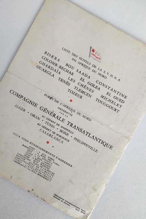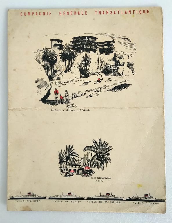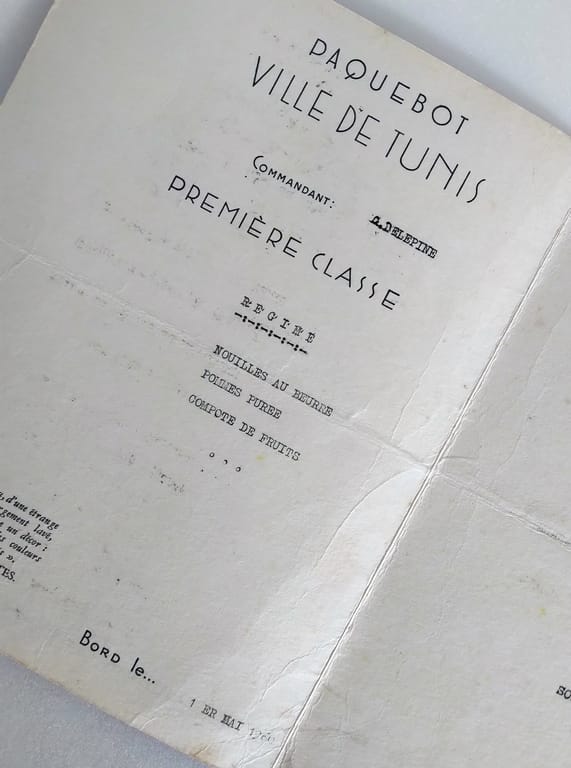 Menu Première classe sur le paquebot transatlantique « Ville de Tunis »