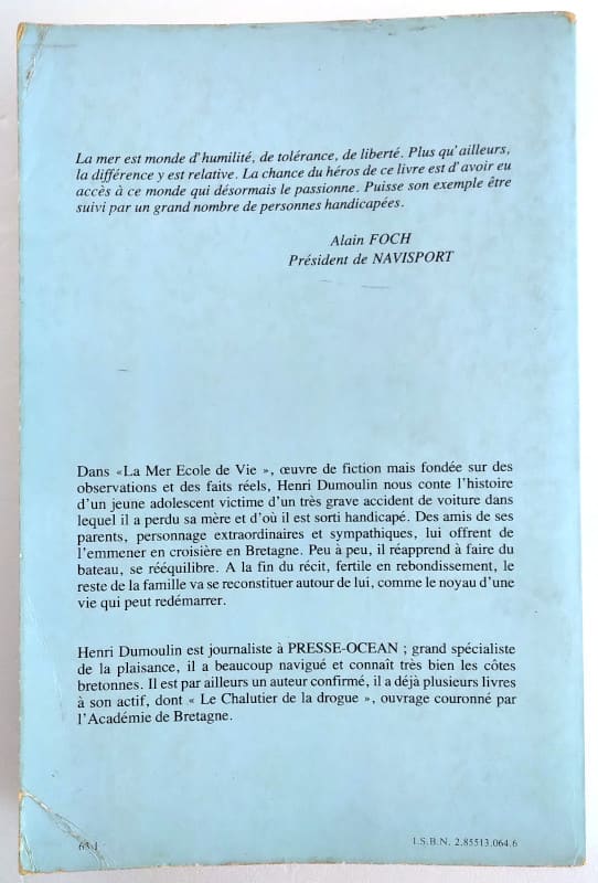 Dans « La Mer École de Vie », œuvre de fiction mais fondée sur des observations et des faits réels, Henri Dumoulin nous conte l’histoire d’un jeune adolescent victime d’un très grave accident de voiture dans lequel il a perdu sa mère et d’où il est sorti handicapé. Des amis de ses parents, personnages extraordinaires et sympathiques, lui offrent de l’emmener en croisière en Bretagne. Peu à peu, il réapprend à faire du bateau, se rééquilibre. À la fin du récit, fertile en rebondissement, le reste de la famille va se reconstituer autour de lui, comme le noyau d’une vie qui peut redémarrer.